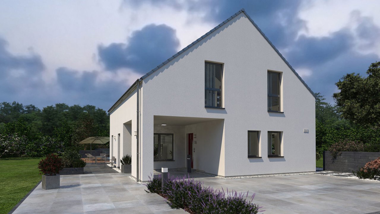 Funktionell, modern und bis ins kleinste Detail durchdacht. Das ist das Design 19.2. Ein Carport sorgt dafür, dass Bewohner und Gäste immer trockenen Fußes in die Diele gelangen und von dort in den großzügig geschnittenen Essbereich mit direkt angeschlossener Küche.