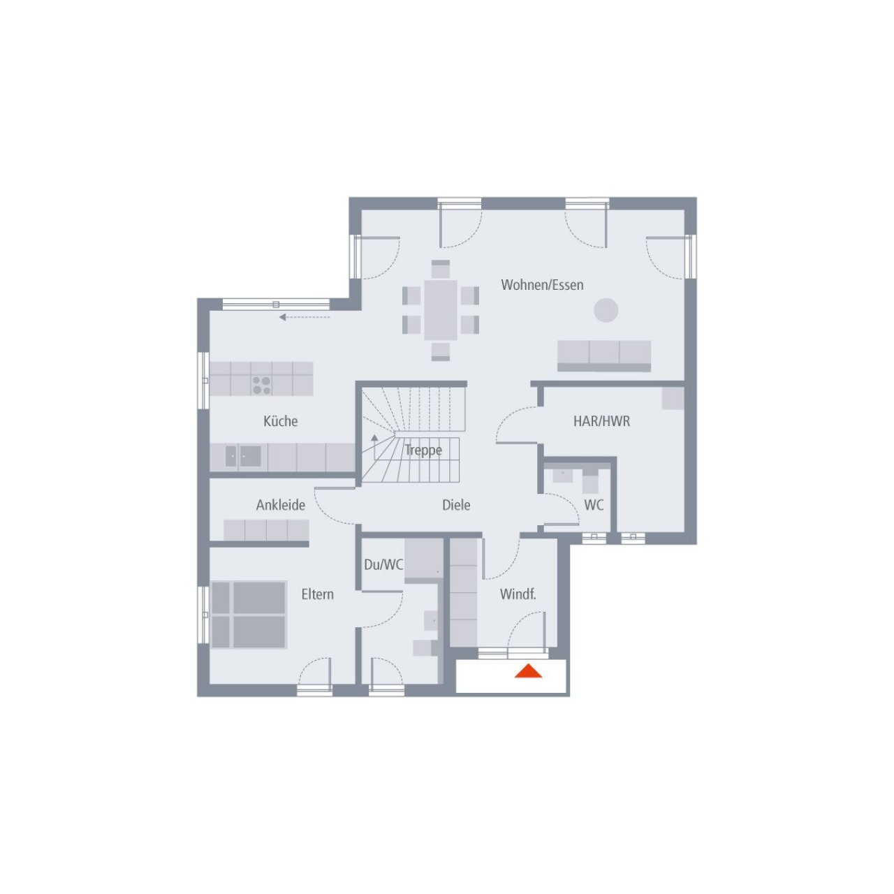 Von hier geht es in den offenen Wohn- und Essbereich mit halboffener Küche, von der ein direkter Zugang zum Außenbereich möglich ist. Außerdem befinden sich der ausgelagerte Elternbereich mit Ankleide und eigenem Duschbad sowie Hauswirtschaftsraum und Gäste-WC im Erdgeschoss.