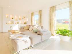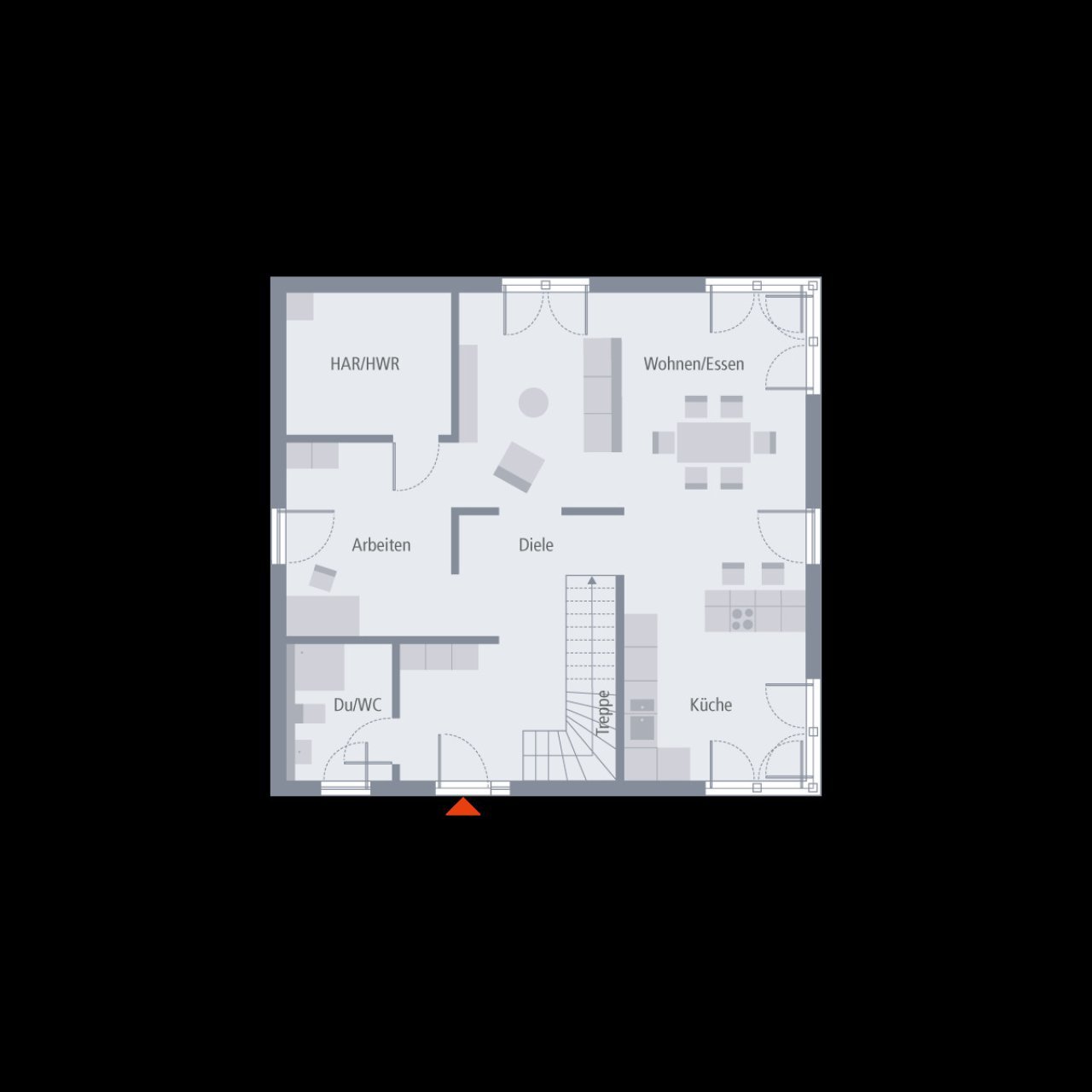 Lediglich das mit Dusche und Toilette ausgestattete Gäste-WC, das sich direkt im Eingangsbereich befindet, sowie der sich an das offene Arbeitszimmer anschließende Hauswirtschaftsraum sind durch Wände von den übrigen Zimmern abgetrennt. Fließend gehen alle anderen Räume ineinander über.